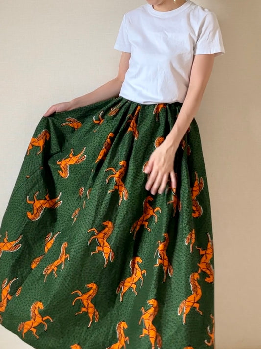 [Made to order] Voluminous long skirt (jumping horse pattern/green)