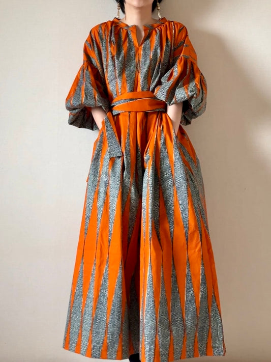 Sold out【受注生産】大統領のペンシル柄/オレンジ・ボリューム袖ワンピース