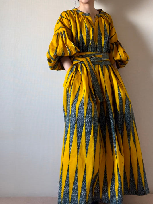 [Made to order] Voluminous sleeve dress (President's pencil pattern/yellow)