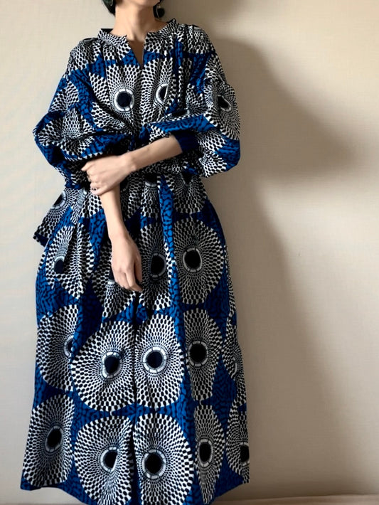 [Made to order] Volume sleeve dress (blue circle pattern)