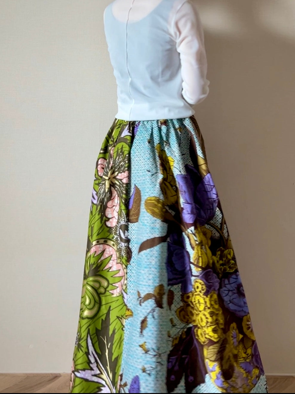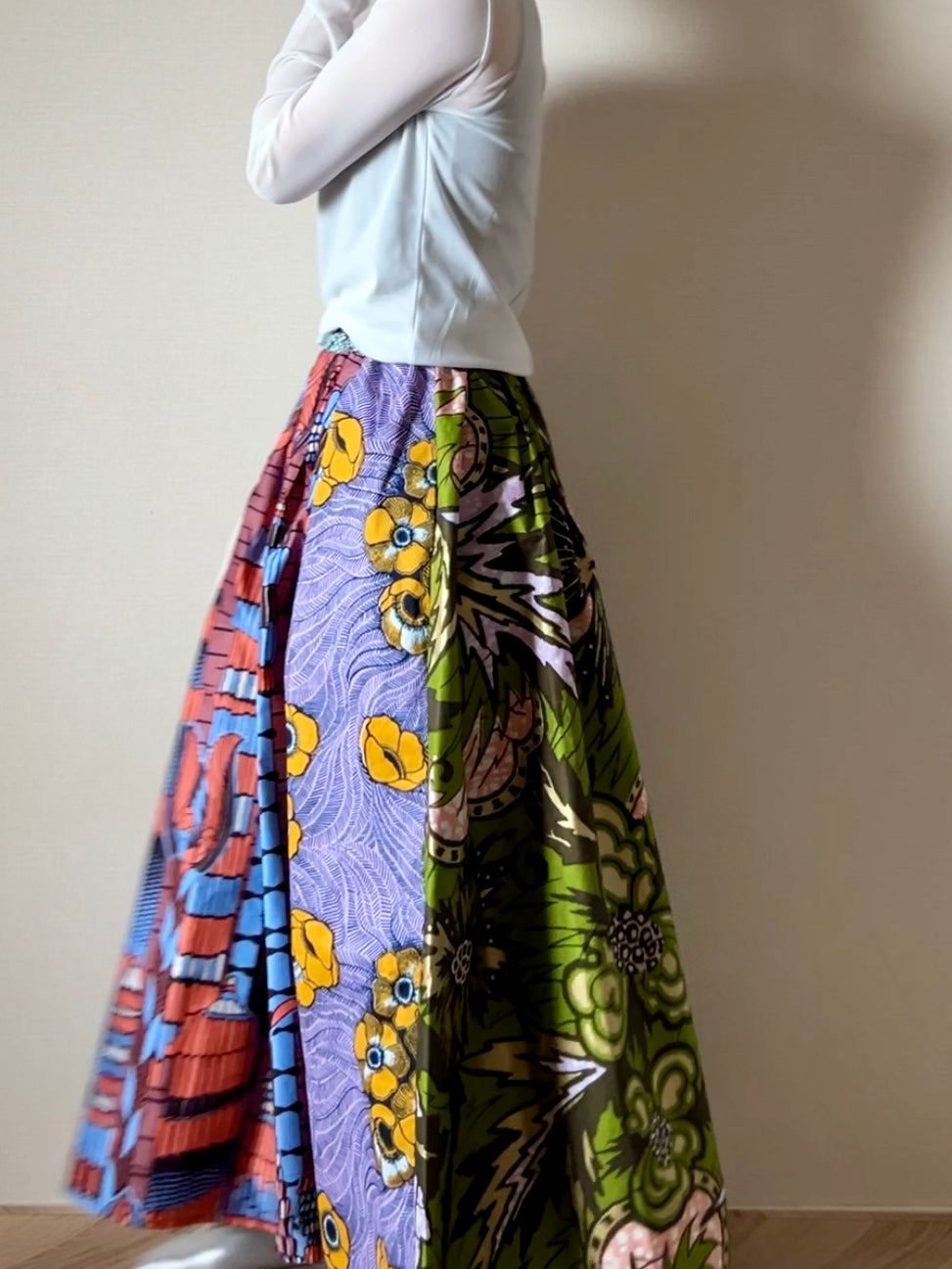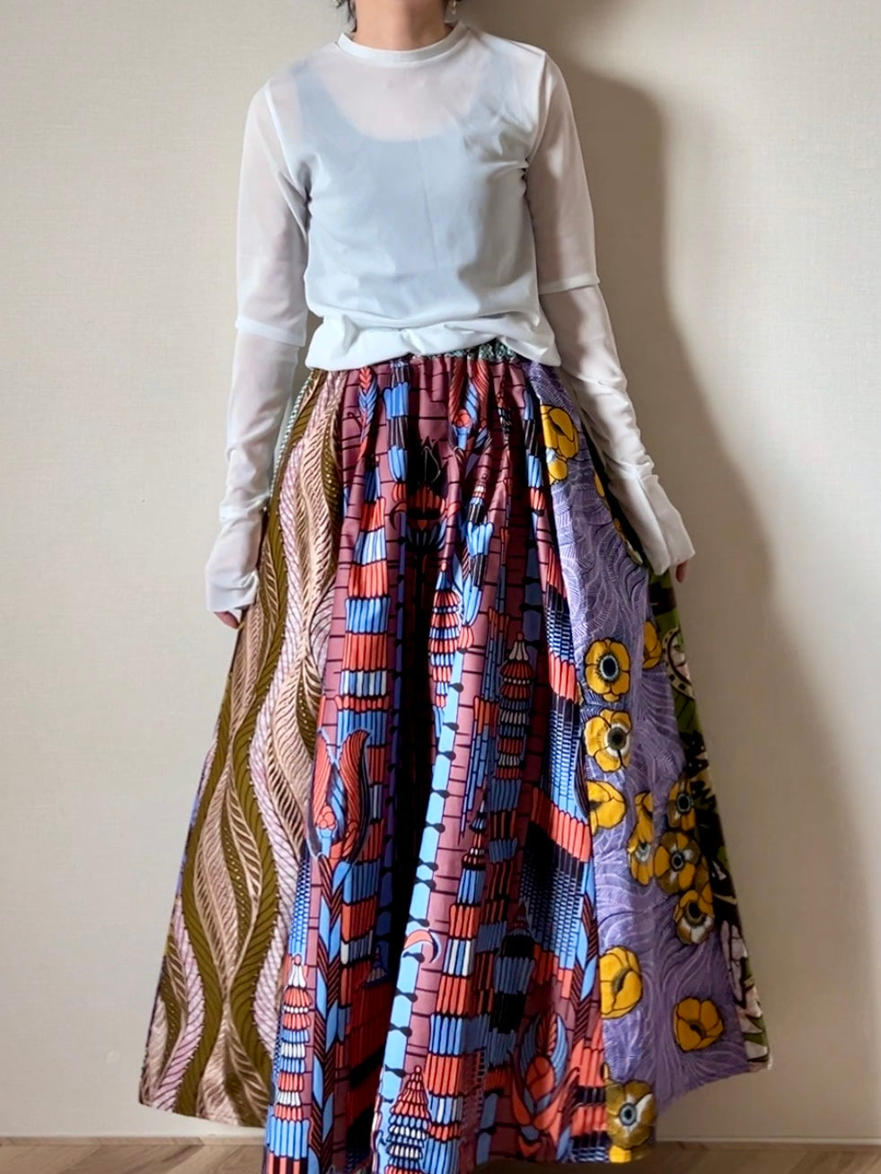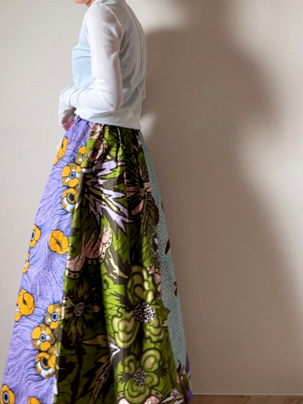 アフリカンバティックの個性である大胆な柄を相談しながら、動きもあり美しいシルエットに仕上がりました。