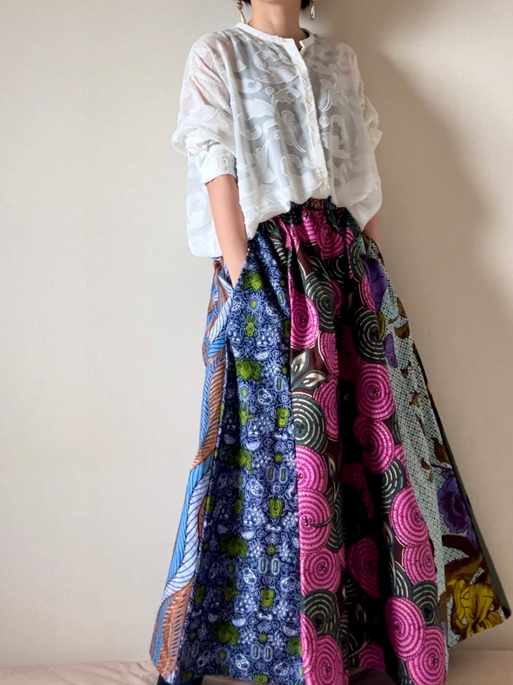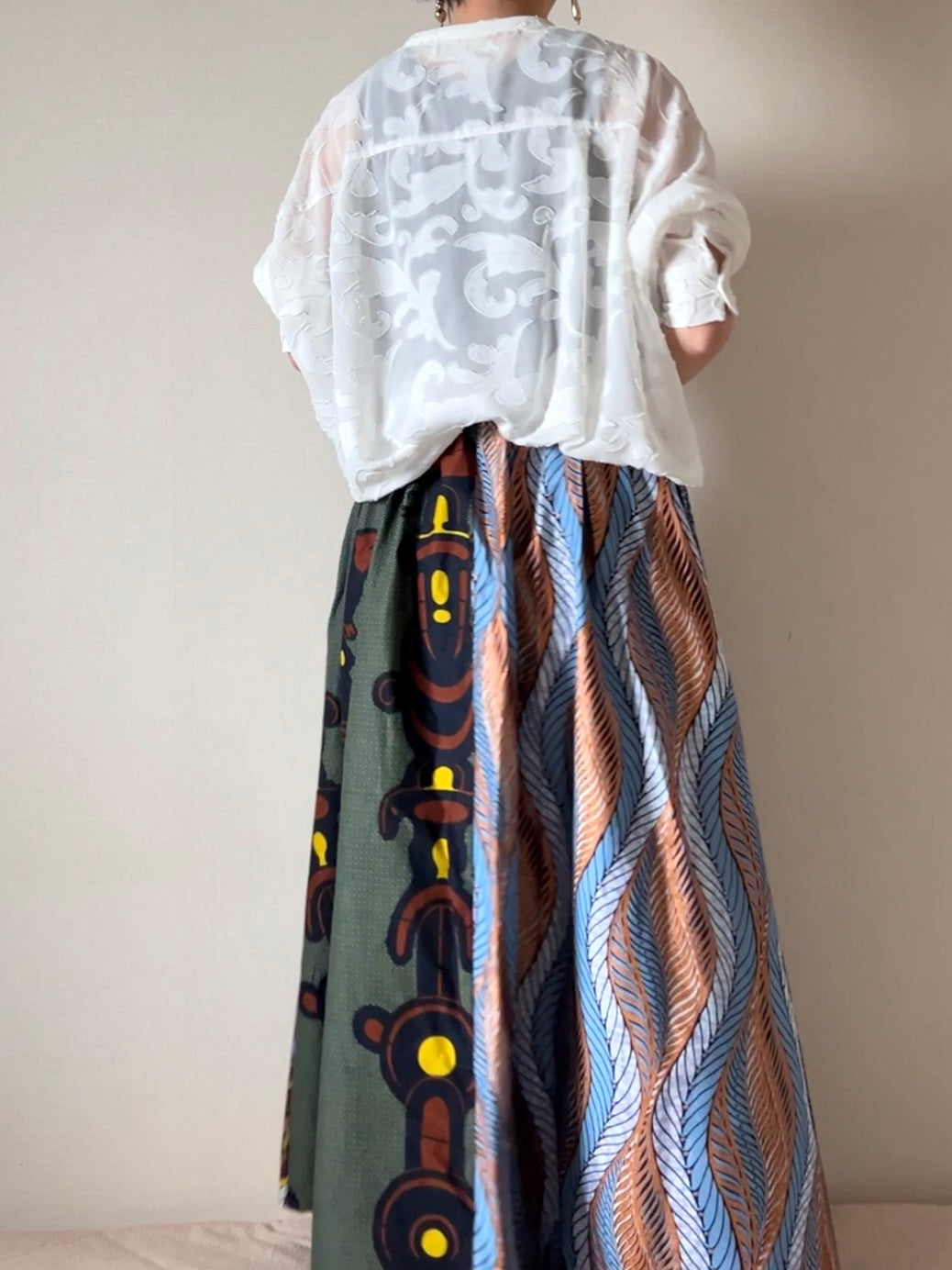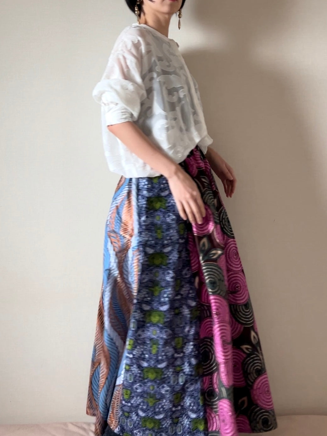 アフリカンバティックの個性である大胆な柄を相談しながら、動きもあり美しいシルエットに仕上がりました。