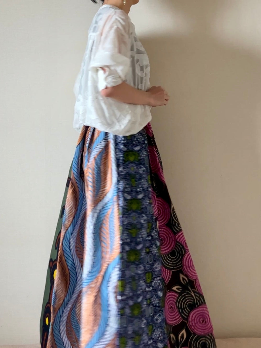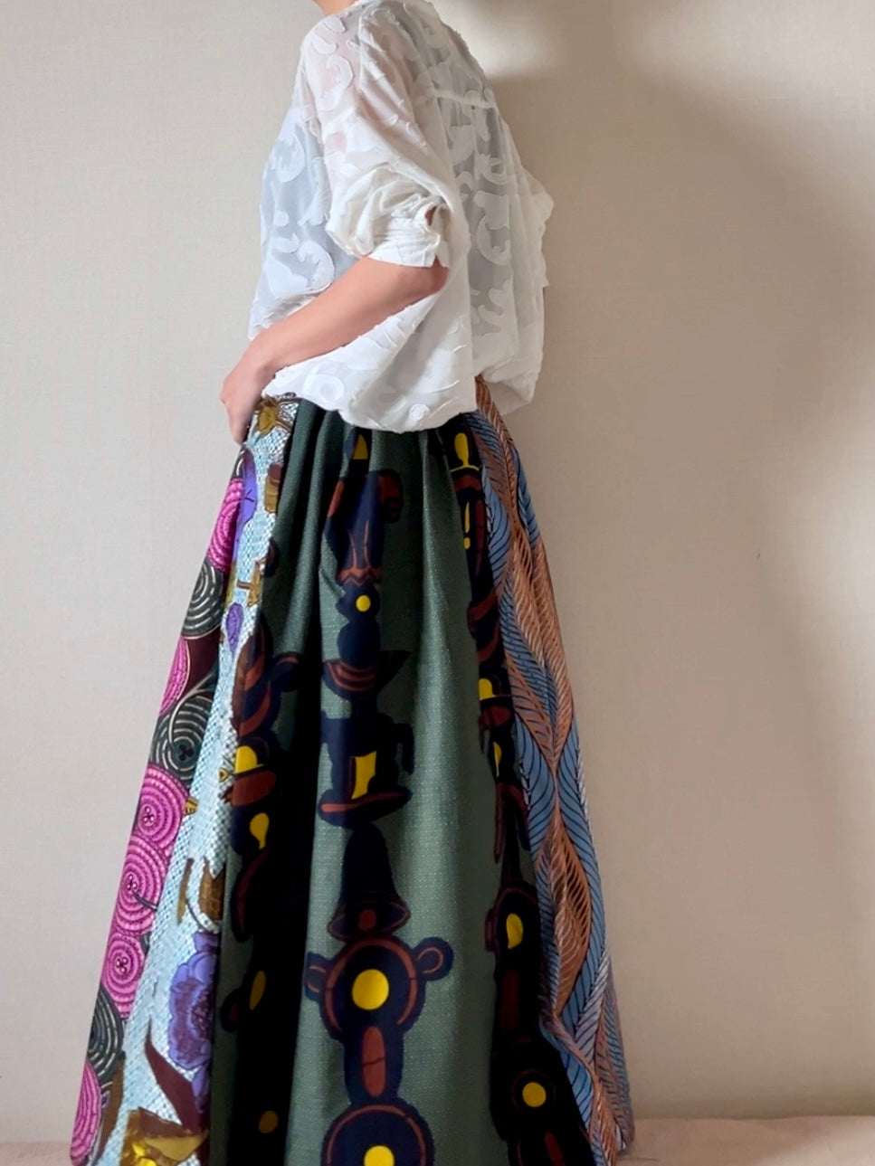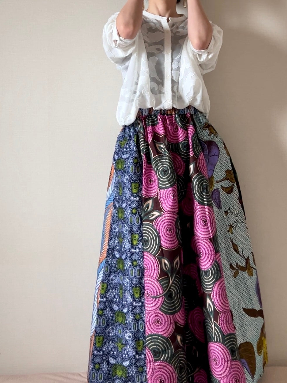 アフリカンバティックの個性である大胆な柄を相談しながら、動きもあり美しいシルエットに仕上がりました。