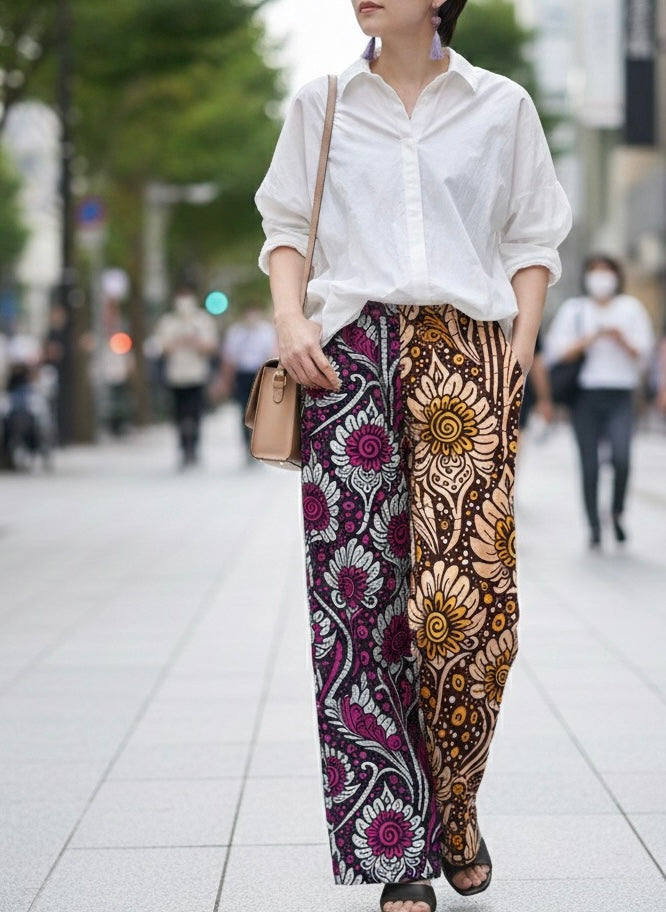 ◆左右で異なる柄を使った、遊び心あふれるツートンデザイン。柄の出方は1本ずつ異なり、同じ組み合わせでも少しずつ異なる表情をお楽しみ頂ける特別感のあるパンツです。