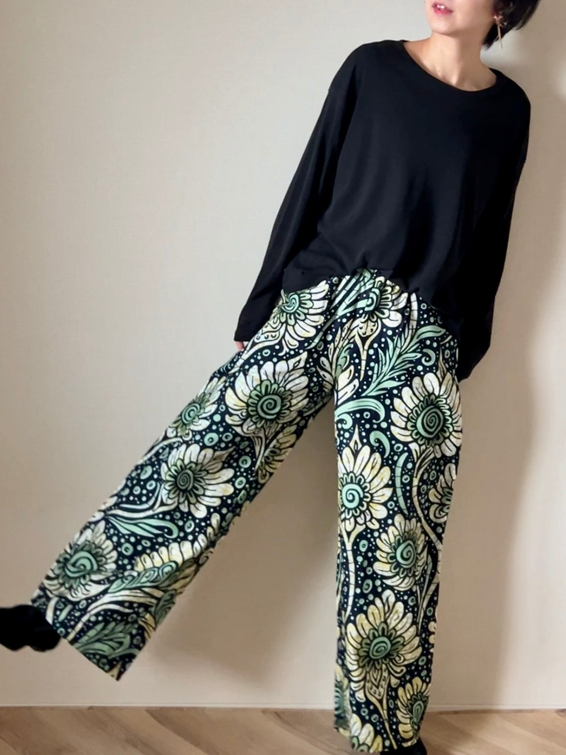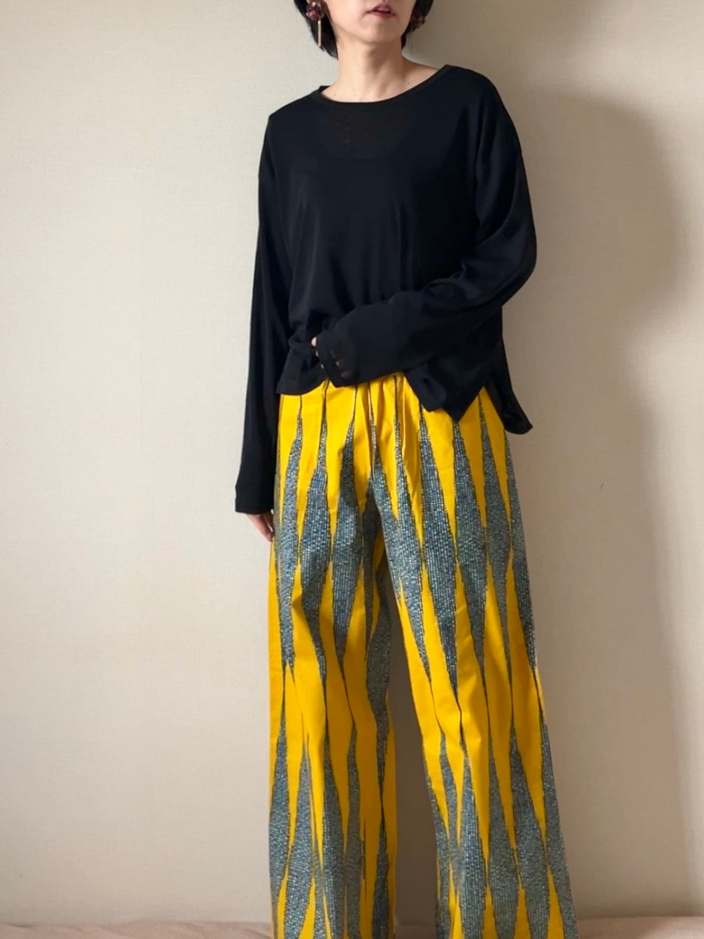 シンプルなTシャツやニットと合わせて、パンツを主役にしたコーデ