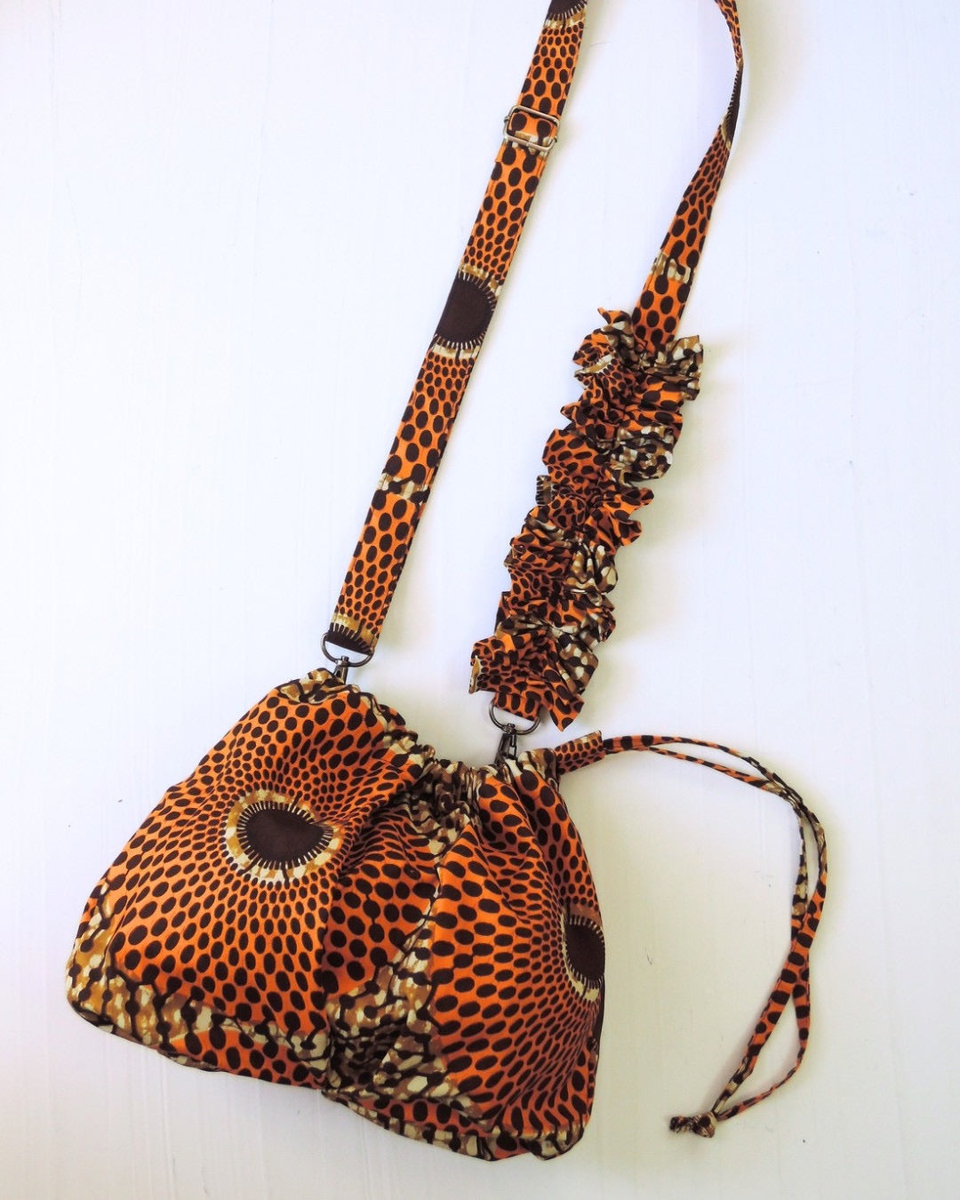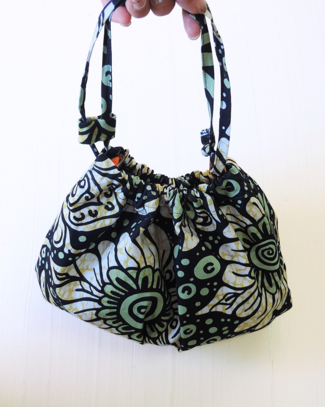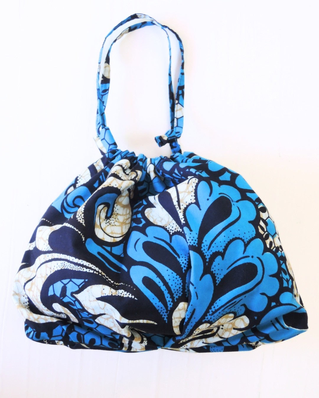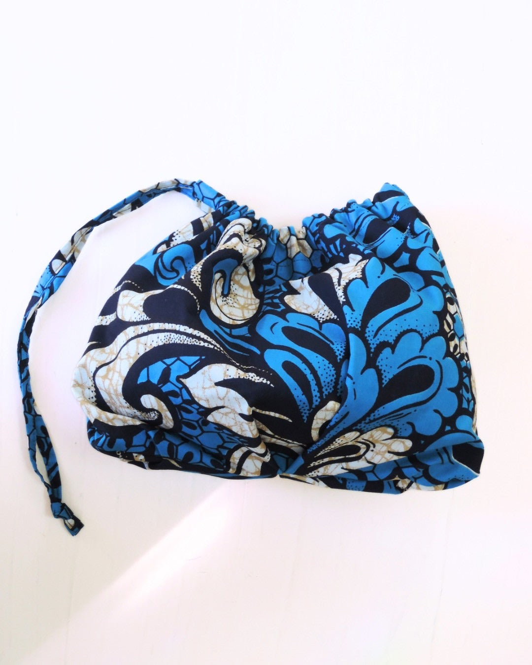アフリカンバティック生地の存在感と、ギャザーを寄せた柔らかなフォルム。
