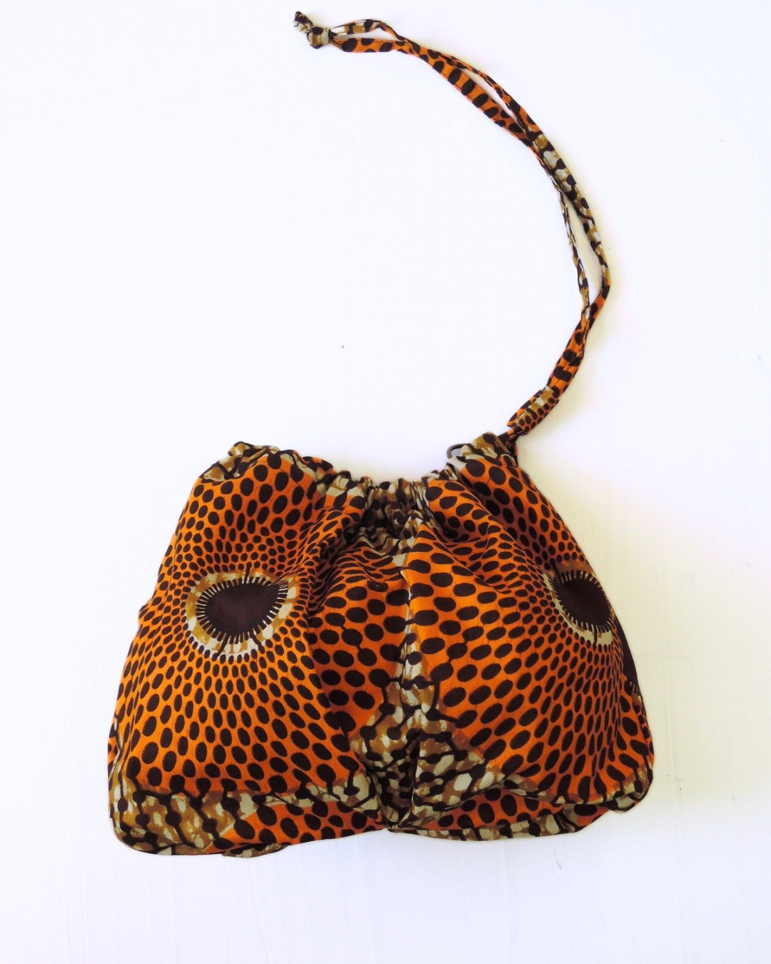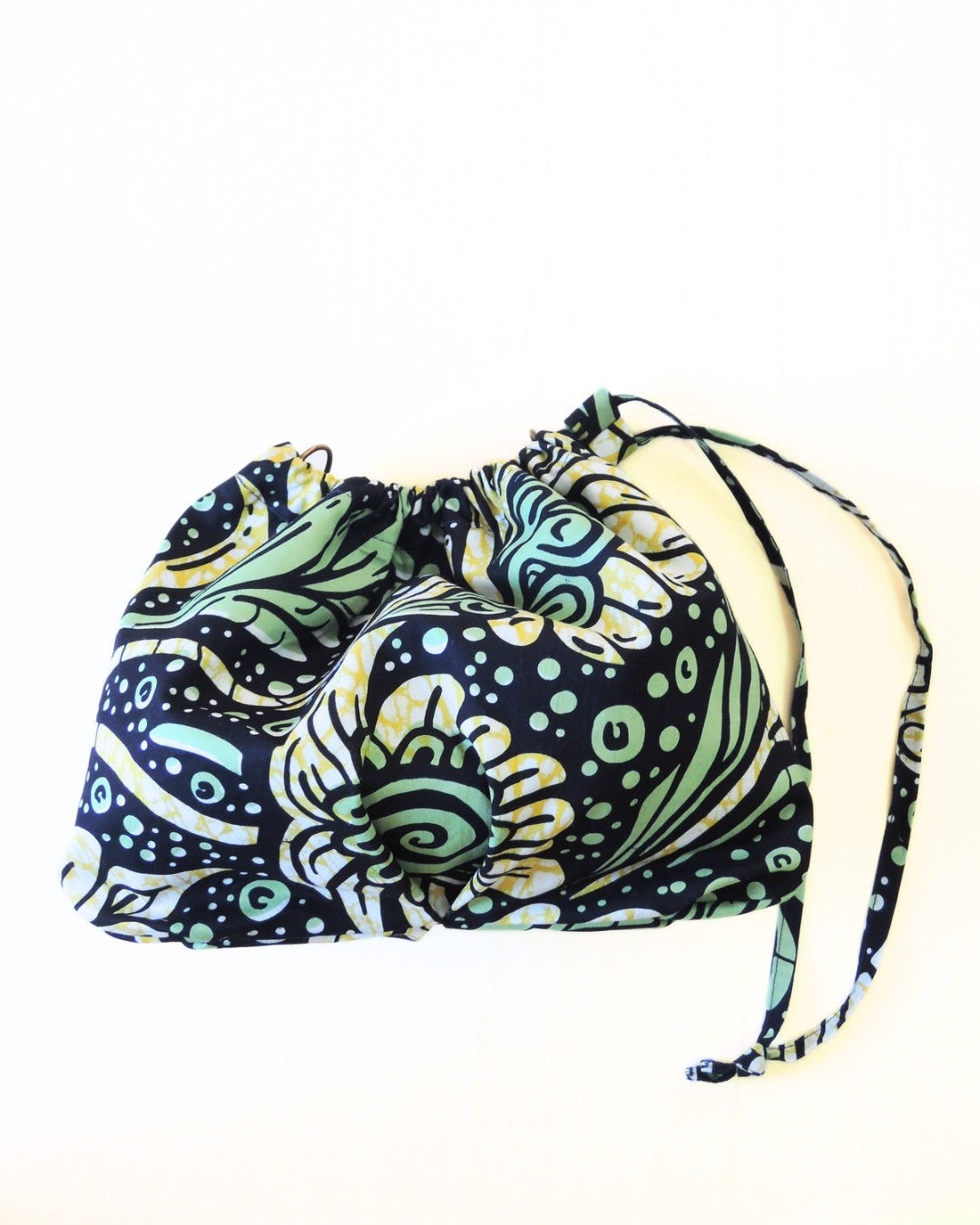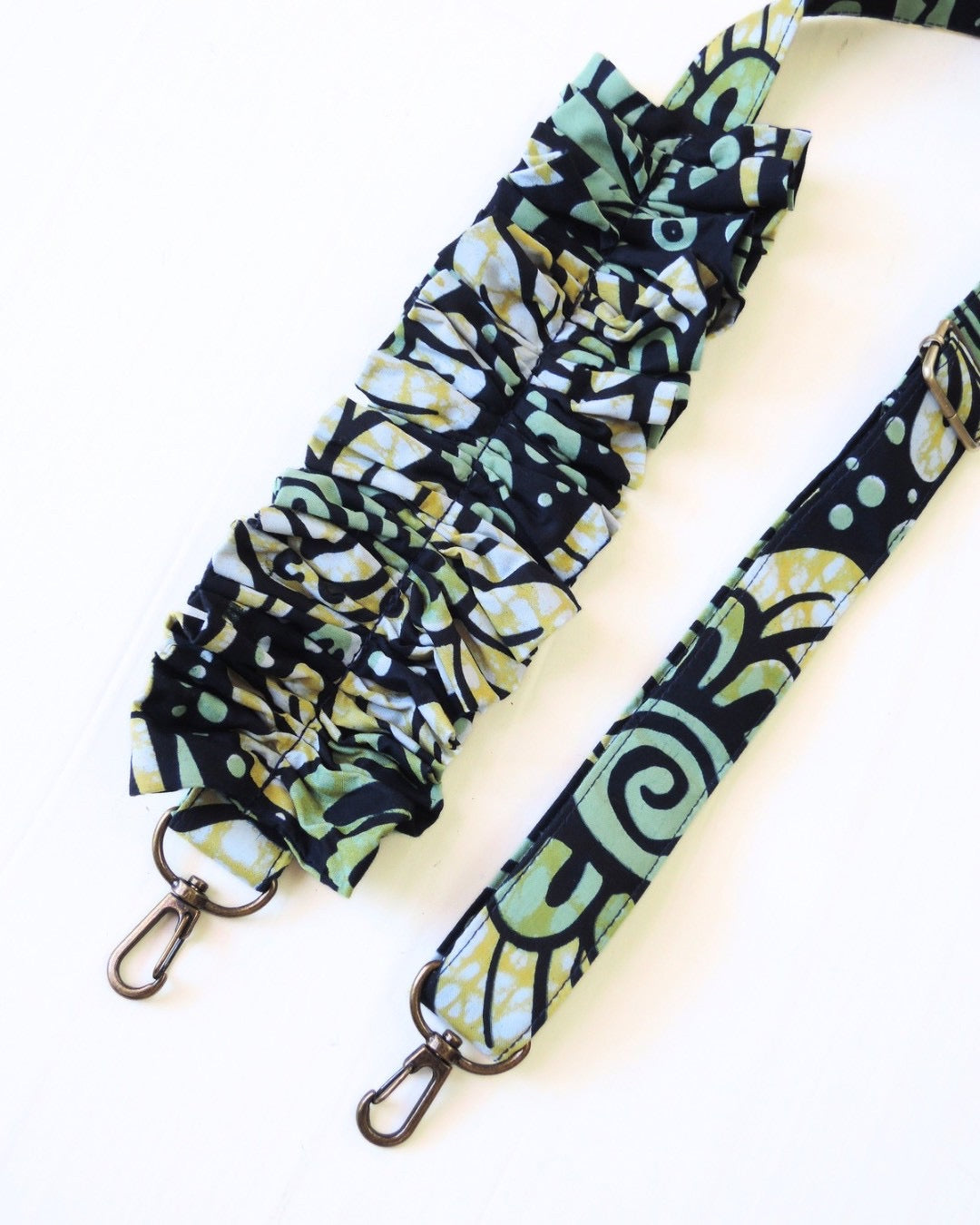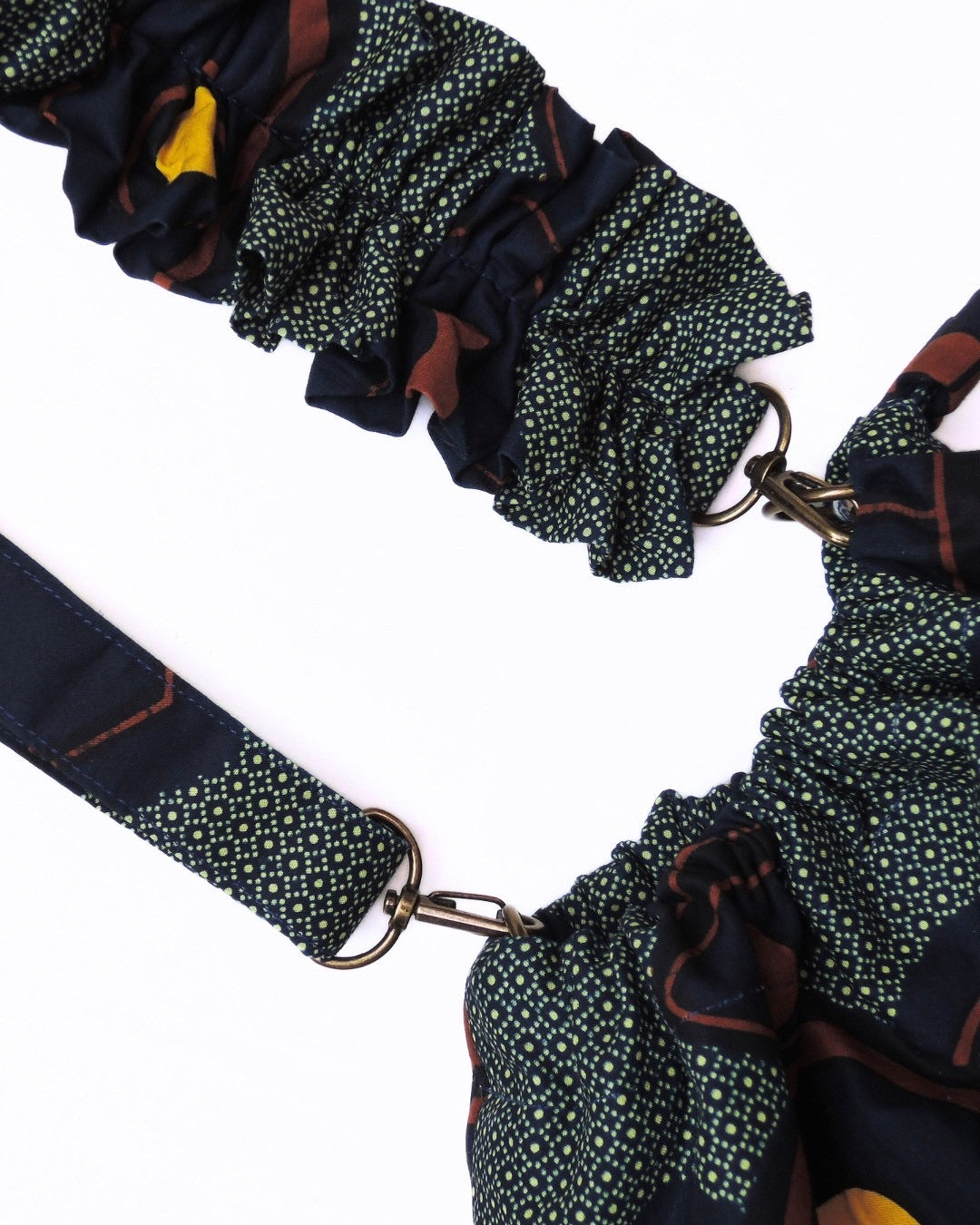 アフリカンバティック生地の存在感と、ギャザーを寄せた柔らかなフォルム。